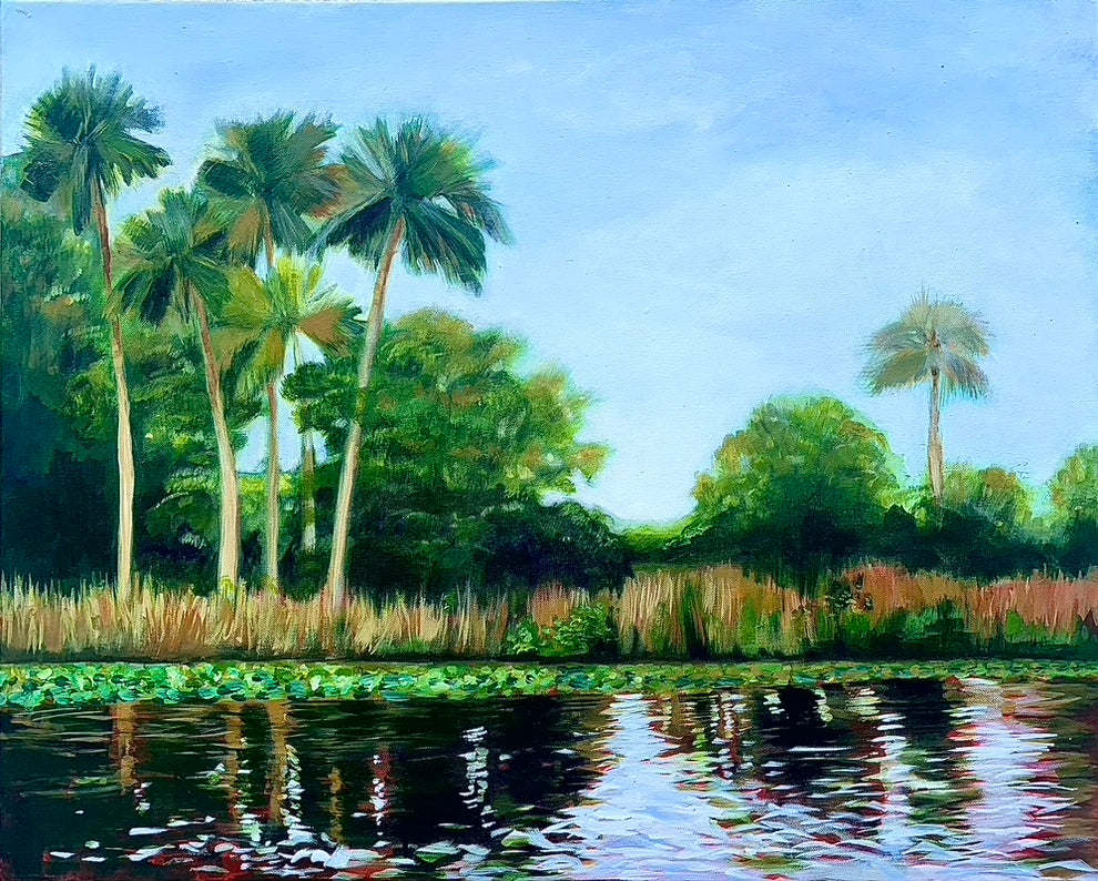 My husband, David, and I love taking a boat out on our local lakes and intracoastal waterways. This painting was a result of one of those trips into "the real Florida," on the St. John's River near Deland.