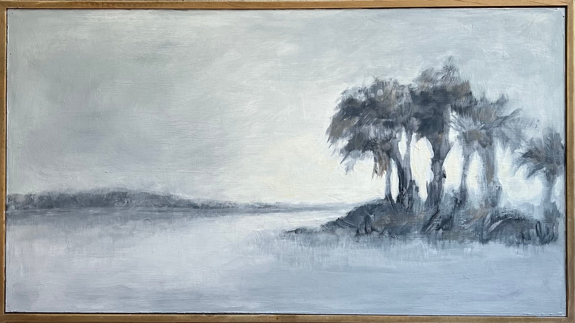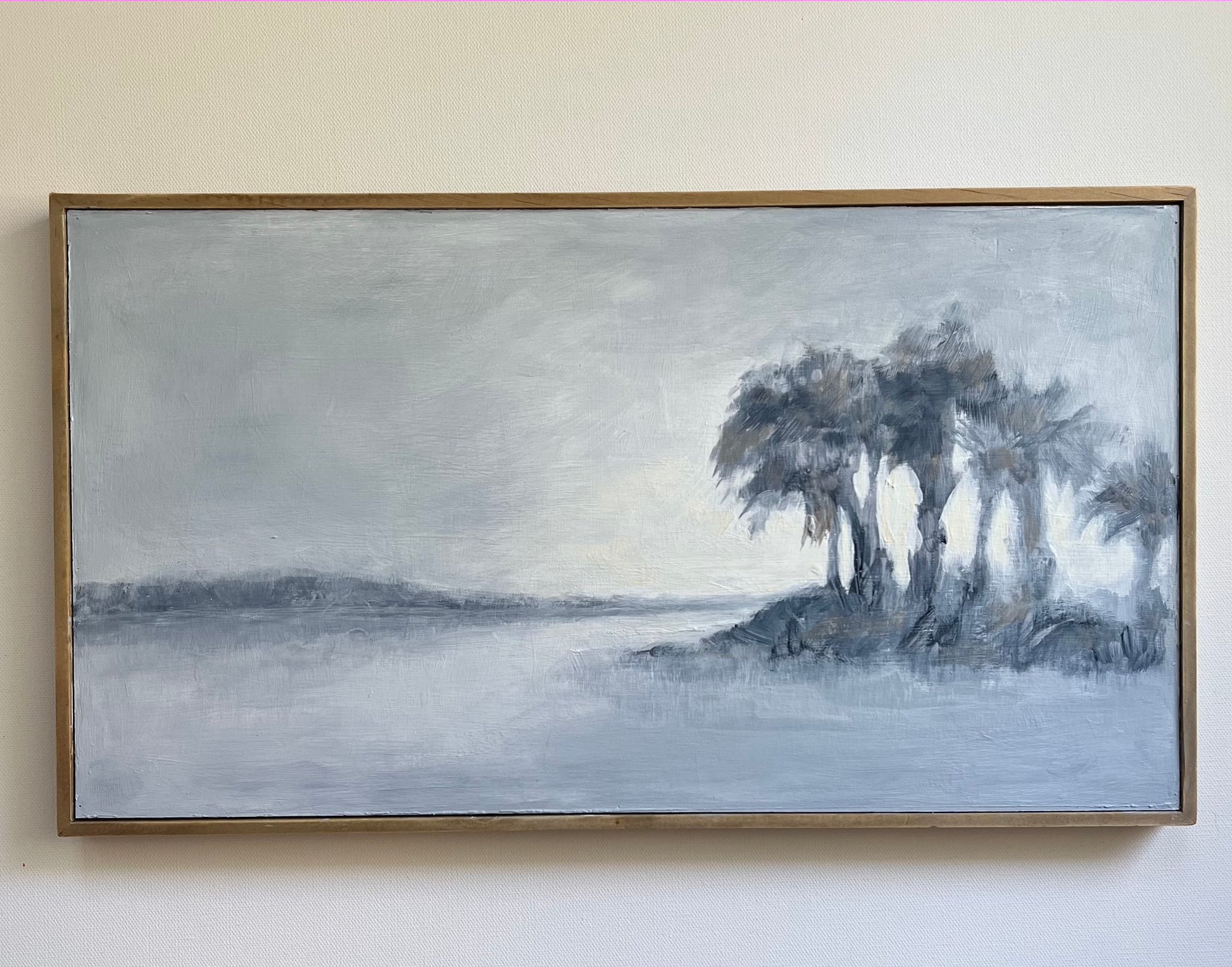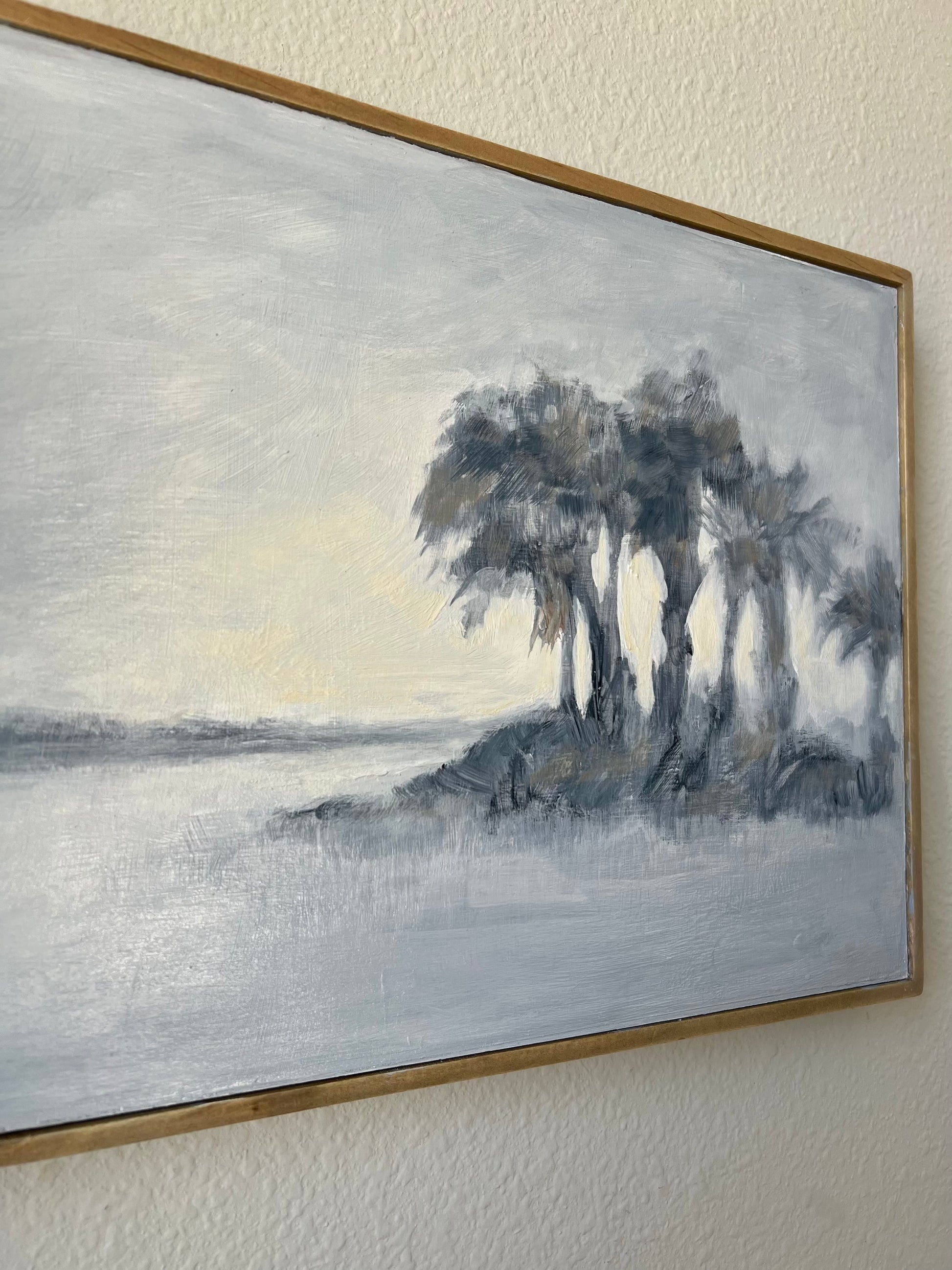Dreamy and impressionistic. This original painting is gently subtle in soft grays with a touch of umber and creamy white. Can't you just see yourself pulling up a boat and anchoring here? I love the natural, neutral gray/wood tone contrast between the frame and the painting.