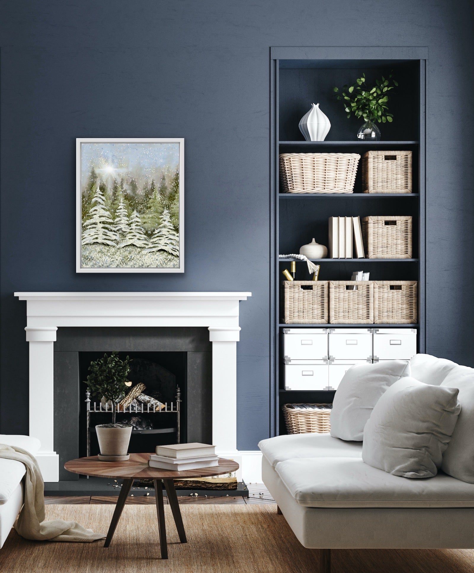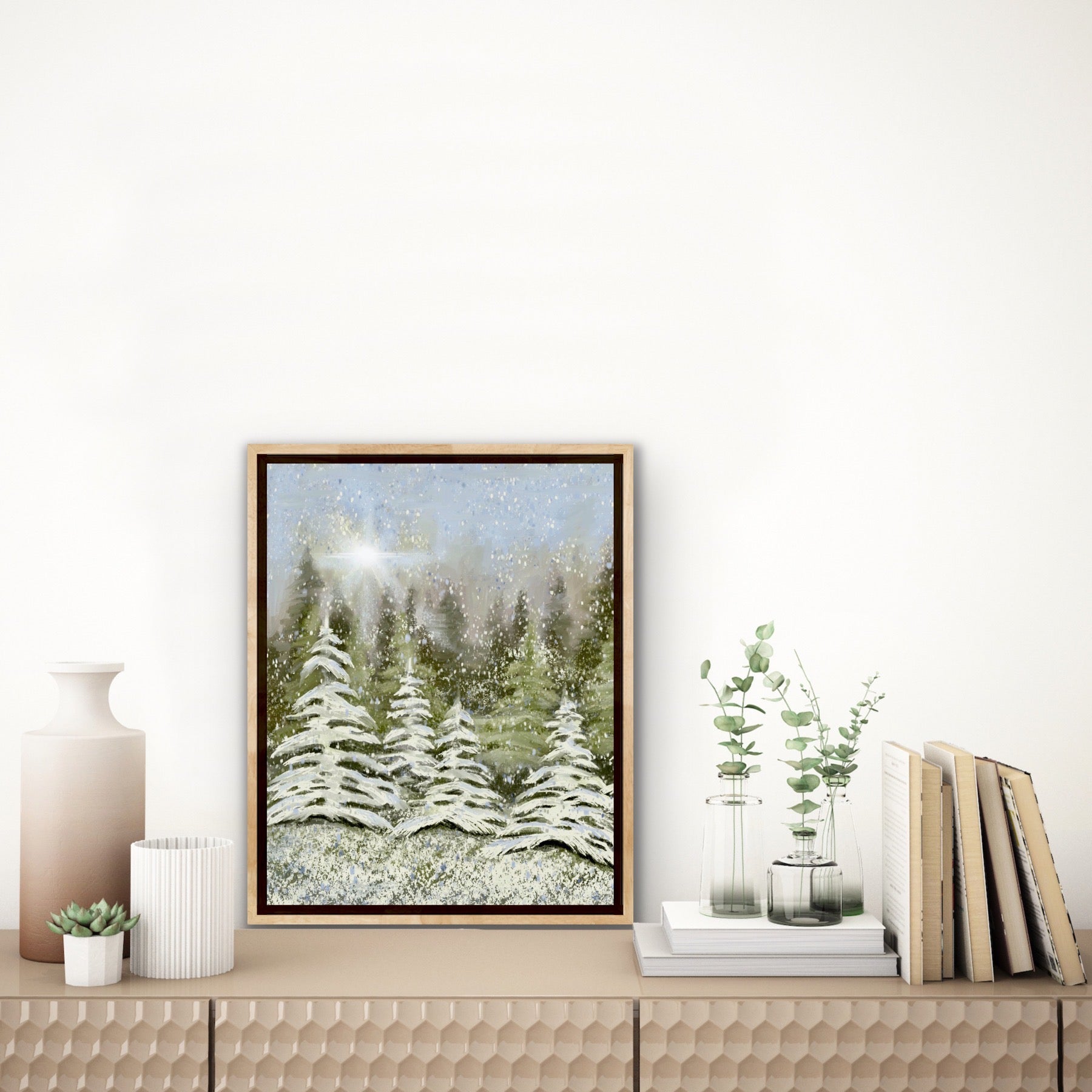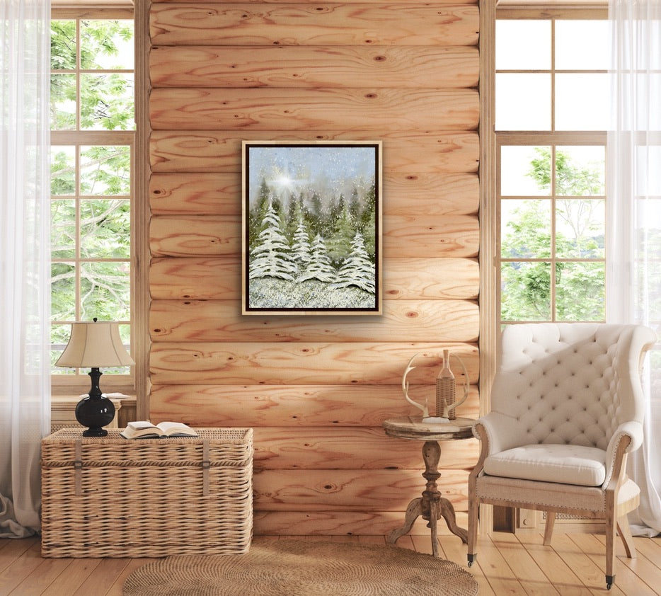 Bring a soft wintery ambiance to your holiday / winter decor with this snowy forest art print from a painting by Caron Loveless.