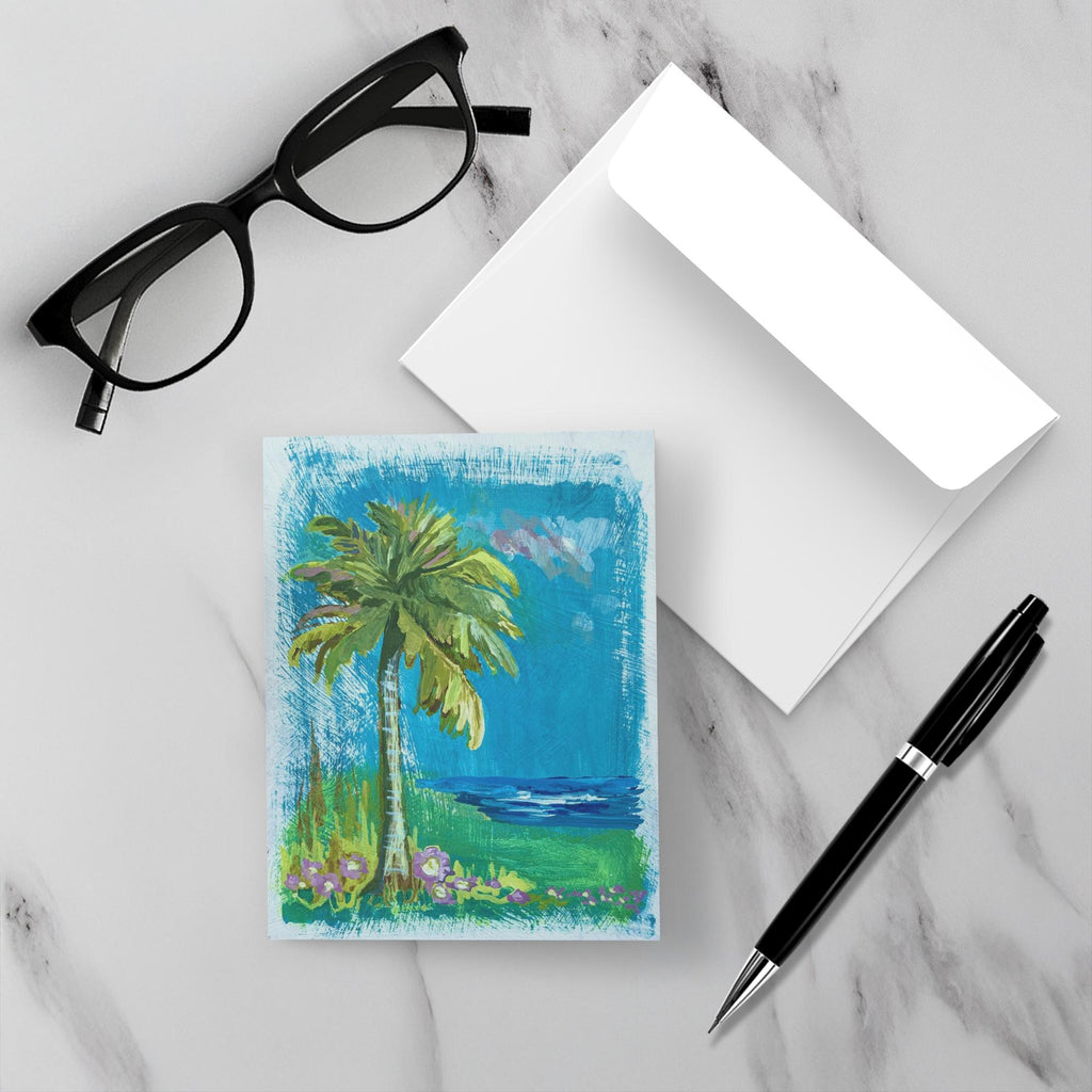 For birthdays or any day, a beautiful way to send a thoughtful note. These high quality sunny palm note cards were created from an original painting by Caron Loveless and come pre-folded, 10 cards to a pack.