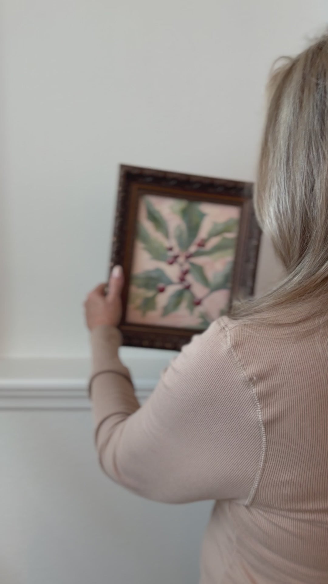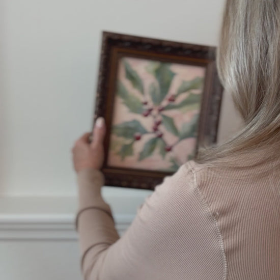 Bright holly leaves and clusters of crimson berries signal one the the quiet joys of winter. I painted Winter's Gift as a simple celebration of the season, fresh greens against a blush background touched with warmth and richness and visible texturizing. It's gentle, natural beauty will elevate any space in your holiday decor.